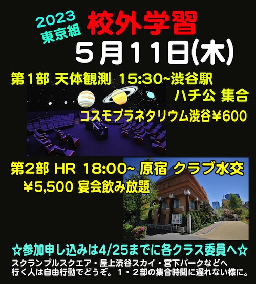 ▼当初計画していた「スクランブルスクエア」「渋谷スカイ」は、5月から料金値上げ・団体チケット購入が非常に難しく、入手出来ても当日の気象により登れない場合があり団体行動には不向きであることが判明しました。そこで第1部は「天体観測」に変更しました。楽しみにしていた人ごめん。