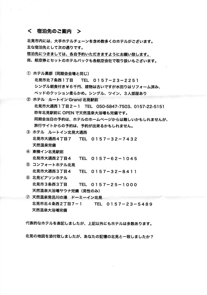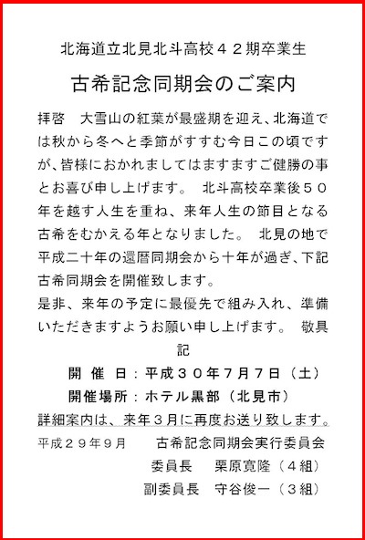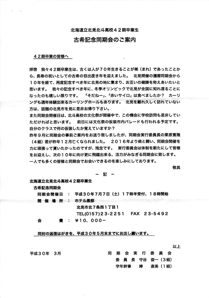 北見の同期会実行委員会から案内が郵送されました。