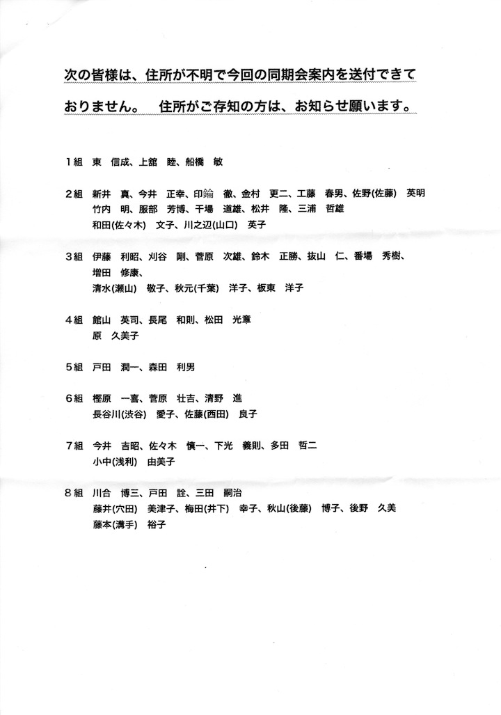 下記の諸君は、住所が不明で同期会案内を送付できておりません。
